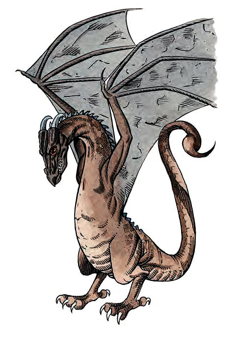 Wyverns are huge flying lizards with a poisonous stinger in their tails. They have 35-foot-long dark brown to sandy yellow bodies, half of which is tail. Their leathery bat-like wings are over 50 feet from tip to tip, and their heads are 4 feet long and filled with long, sharp teeth. Wyverns have only hind legs, which they use in the same way that hunting birds do. The tip of their tails is a thick knot of cartilage from which a 2-foot-long stinger protrudes, similar to that of a scorpion. Their eyes are red or orange, and they do not have a strong odor, although their lairs may smell of a recent kill. Wyverns can make two sounds: a loud hiss, which sounds like a hot sword plunged into water, and a low, deep-throated growl, similar to that of a bull crocodile.