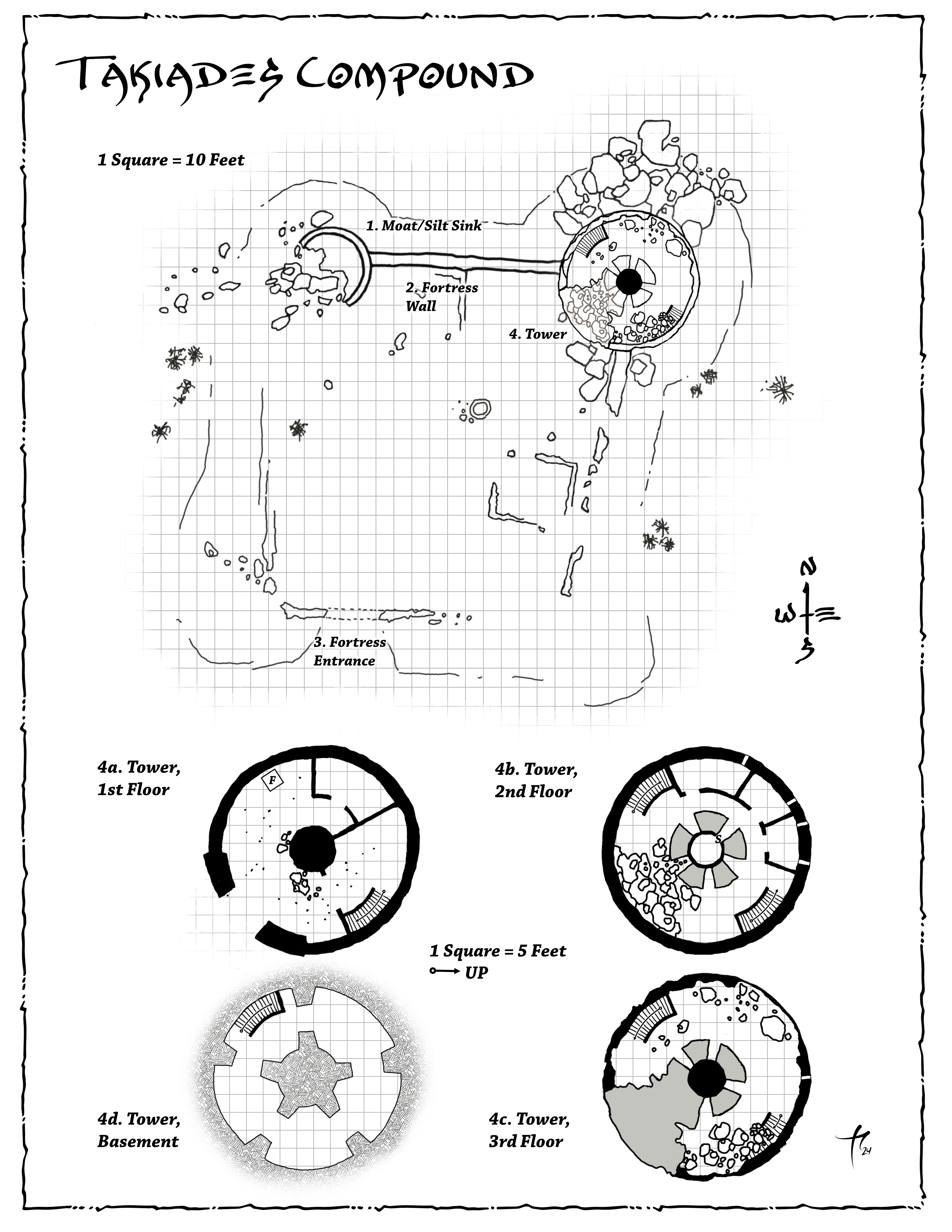 4) Tower - The fortress’ main tower still stands here, weathered and worn down by the elements, its uppermost floor open to the sky. Though clearly damaged, the tower is easily the most defensible portion of the fortress.